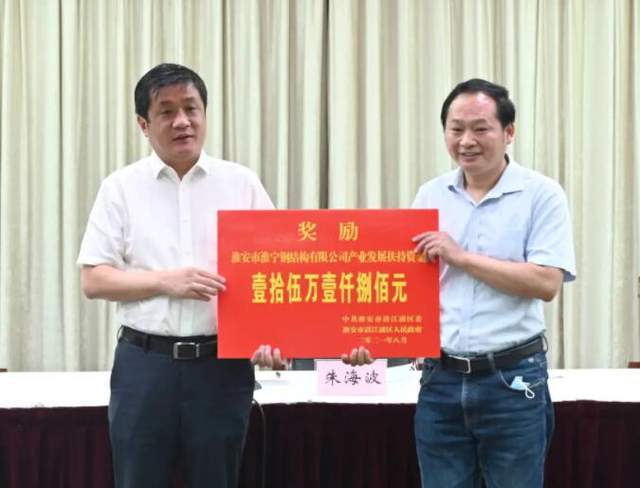 8月14日下午,淮安市清江浦區(qū)召開2021年第二季度產(chǎn)業(yè)發(fā)展扶持資金兌現(xiàn)大會(huì),對(duì)淮安市淮寧鋼結(jié)構(gòu)有限公司等多家企業(yè)進(jìn)行表彰。區(qū)委書記朱海波出席會(huì)議并講話,區(qū)委副書記、清河經(jīng)濟(jì)開發(fā)區(qū)黨工委書記高進(jìn)鋒主持會(huì)議,區(qū)領(lǐng)導(dǎo)孫愛超、薛莉、于升、王磊等參加會(huì)議。董事長陳國寶參加會(huì)議,并接受壹拾伍萬壹任捌佰元現(xiàn)金獎(jiǎng)勵(lì)。